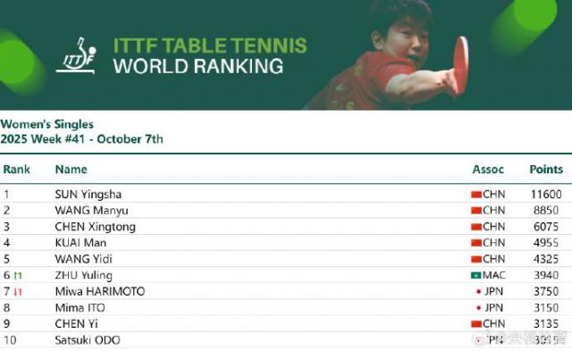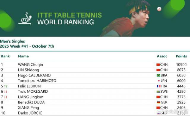国际乒联公布 2025 年第 41 周排名。男单方面,王楚钦凭借在 WTT 中国大满贯中夺冠,世界排名积分从 9425 分跃升至 10900 分,成为男子乒坛历史上首位积分破万的运动员,刷新了国际乒联现行积分规则下的最高纪录。女单方面,"万分女王"孙颖莎继续领跑世界排名。
