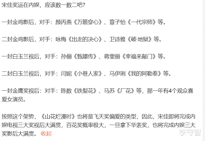 宋佳二封影后惹争议,上次拿金鸡奖的表现,不少人觉得也不如章子怡颜丙燕,所以新账旧账一起算,角色宋佳这两年奖项运太好了,虽然也算有实力,但也太幸运了,甚至被质疑是签约了杨天真的公司,所以被质疑有被资本运作的嫌疑。
