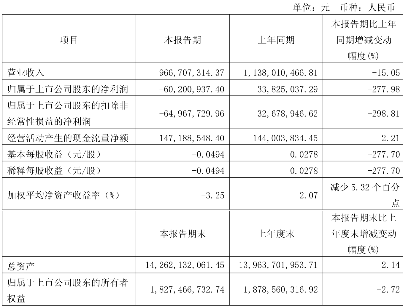 中证智能财讯郑州煤电(600121)4月26日披露2025年第一季度报告。公司实现营业总收入9.67亿元,同比下降15.05%;归母净利润亏损6020.09万元,上年同期盈利3382.5万元;扣非净利润亏损6496.77万元,上年同期盈利3267.89万元;经营活动产生的现金流量净额为1.47亿元,同比增长2.21%;报告期内,郑州煤电基本每股收益为-0.0494元,加权平均净资产收益率为-3.25%。