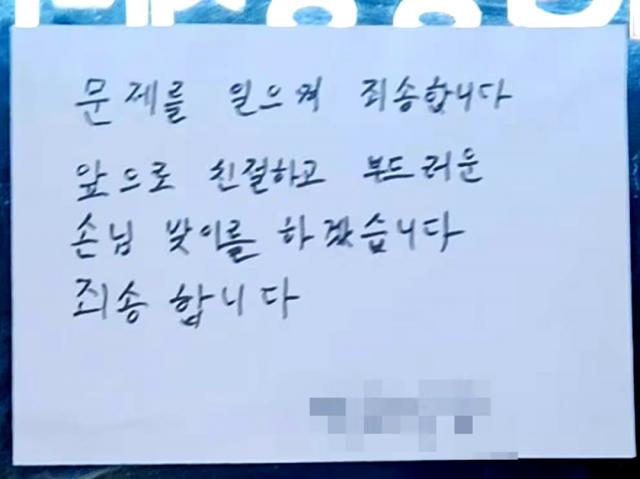 事后店家在门口张贴了用 A4 纸手写的道歉信。(图 /JoongAng)